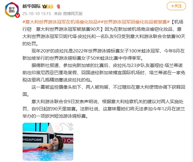 因为在新加坡机场商店偷窃化妆品,意大利世界游泳冠军贝妮代塔·皮拉托和一名队友9日受到意大利游泳联合会禁赛90天的处罚。